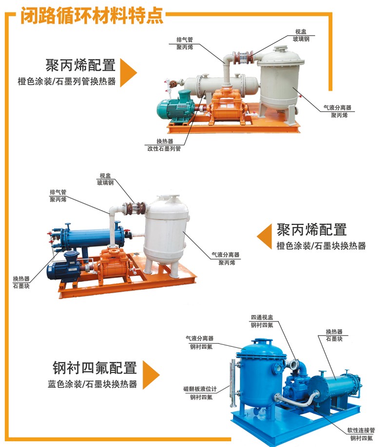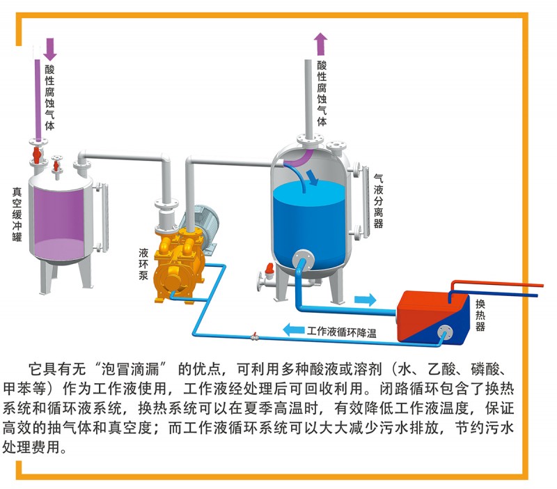 耐腐蝕液環(huán)泵可以升級為閉路循環(huán)系統(tǒng),它由FSK系列、F2SK系列、F2BV系列、F2BE系列和JZJFS羅茨泵系列,與真空換緩沖罐、汽液分離器、換熱器、連接管路等串聯(lián)組成。閉路循環(huán)與用戶DCS 連接可實現(xiàn)自動控制。